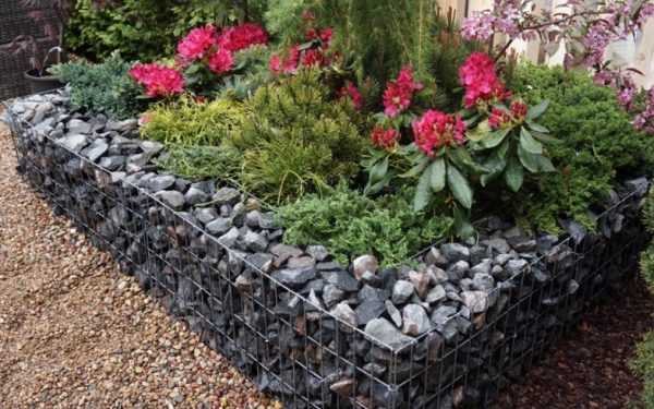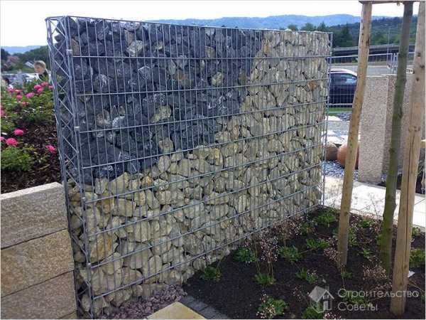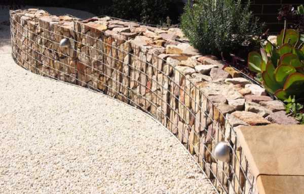 Что касается камней, то тут ограничений нет, главное – чтобы их размер был больше размеров ячеек сетки. Вместо камня можно закладывать гальку, при этом подбирать не однотонный булыжник, а с разными оттенками. Но главная в габионе – это сетка, которая выполняет функции каркаса.