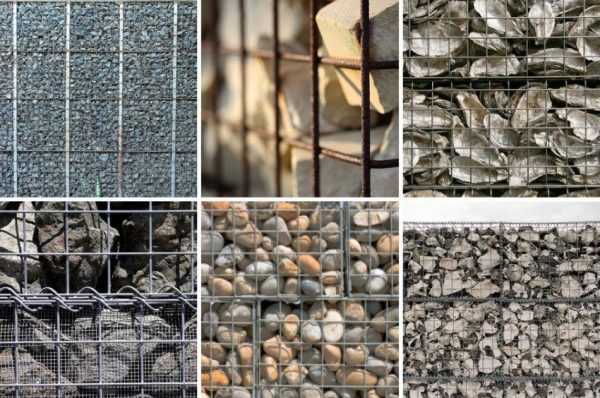 Материал подбирают по цвету, виду, размеру, причем, важно, чтобы единица наполнителя была на 60% крупнее, чем размер клетки каркаса. Металлическая сетка, из которой изготавливают стенки сооружения должна быть изготовлена методом двойного кручения, покрыта антикоррозийным составом, иметь толщину не 4 мм. Ячейки могут быть квадратные, прямоугольные, в форме шестигранника.