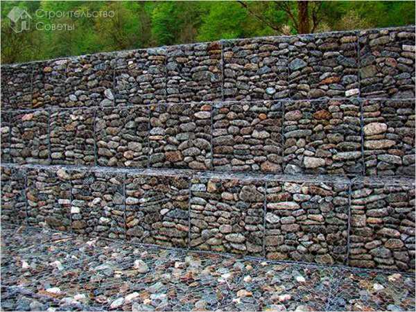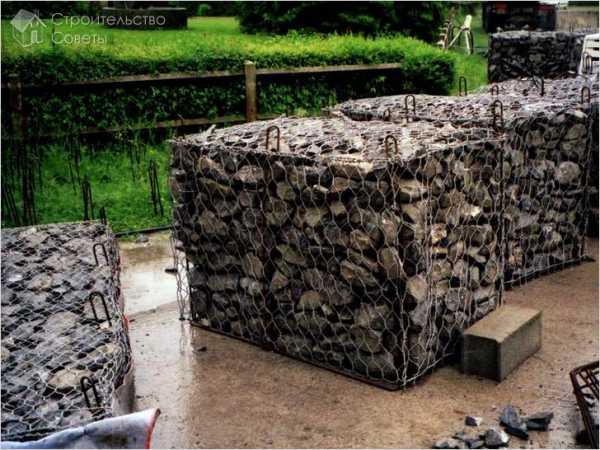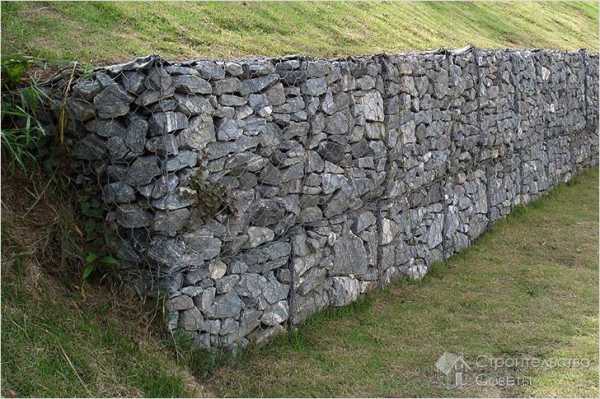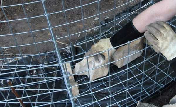 - Размер камней может колебаться от 7 до 40 см. Материал должен быть однородным и плотным. Важно, чтобы диаметр ячеек сетки был меньше диаметра камней, иначе они будут вываливаться из конструкции.