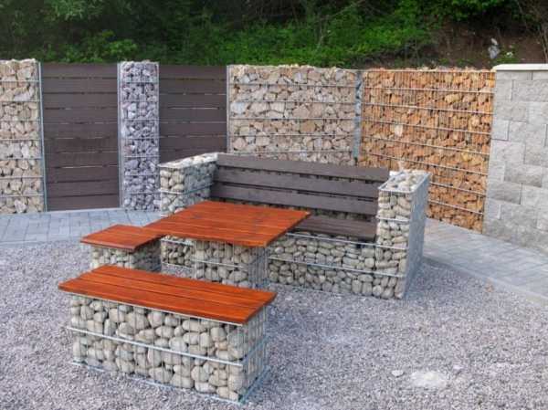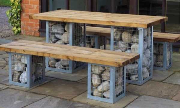 Из габионов можно изготовить оригинальный садовый стол со скамьями