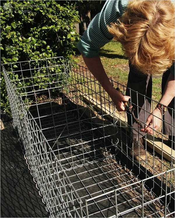 Работать с вязаной сеткой проще всего, потому что это уже готовое изделие – гибкое, но прочное, из которого можно собрать, в принципе, любую форму: куб, цилиндр, сферу и прочее. Вот пошаговая инструкция сборки габиона своими руками.