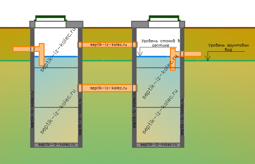 Обычно подобный канализационный колодец на приусадебном участке делается один. Однако возможен и вариант со строительством переливной выгребной ямы. Эта конструкция предусматривает установку двух резервуаров, которые соединены меж собой трубой-переливом.