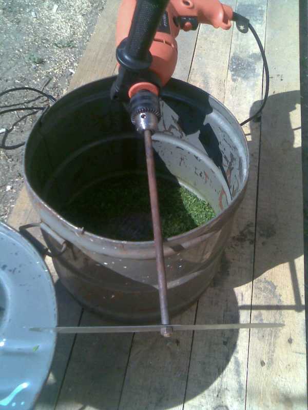 Будет достаточно использования дрели с двумя режимами работы, которые развивают мощность порядка 850 Вт. Необходимо лишь правильно заточить нож, который должен быть максимально острым, что позволит режущему инструменту даже при небольшой скорости вращения быстро рассекать траву, измельчая ее в мелкую кашу. Корпус устройства выполняется из металлического ведра, в днище которого следует проделать отверстие и вставить в него сверло с насаженным острым ножом.