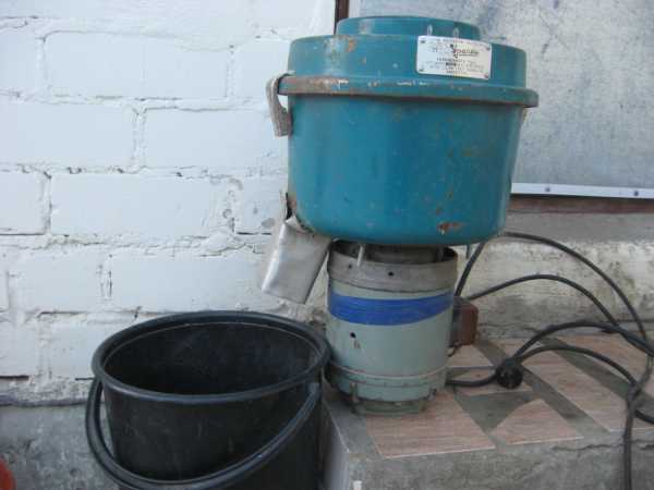 Изготовлен такой кормоизмельчитель на основе старого пылесоса Тайфун. Впрочем, можно использовать корпуса от старых советских пылесосов, которые будут иметь подходящие по размерам верхние отверстия. Отлично подойдет любая цилиндрическая емкость, отрезок трубы, ведро, кастрюля и т. д. Привод сучкорезки можно сделать из мотора от старой стиральной машины мощностью около 180 Вт.