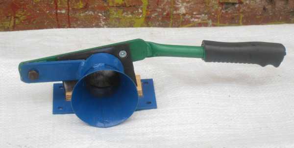 Для заготовки корма из травы в небольших количествах целесообразнее использовать ручной измельчитель травы, который без проблем можно смонтировать к столу шурупами и болтами. Трава, а также небольшие сухие стебли понемногу подаются к ножу через входное направляющее отверстие. При правильной сборке нож будет плотно прижат к отверстию, что позволит измельчать траву на нужную фракцию. Когда нож полностью опускается, он упирается в деревянную планку, что позволяет разрезать траву, а также предотвратить быстрое затупление ножа.