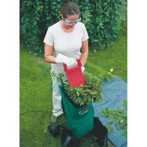 - При использовании измельчителя необходимо надевать резиновые перчатки, защитную маску и очки. Часть измельченных веток и травы может попадать в глаза, а также во время работы прибора выделяется пыль, которую нежелательно вдыхать.