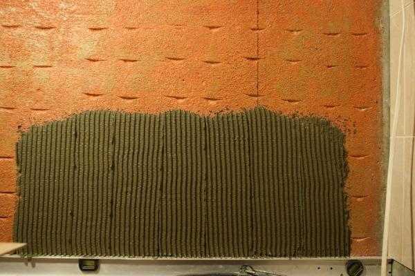 Приготовив плиточный клей, его с помощью гребенчатого шпателя распределяют по поверхности стены. Это должна быть полоса высотой не больше размера 2 плиток. В противном случае клей успеет высохнуть, прежде чем будут уложены декоративные элементы. О том, как правильно уложить плитку на стену, смотрите в этом видео: