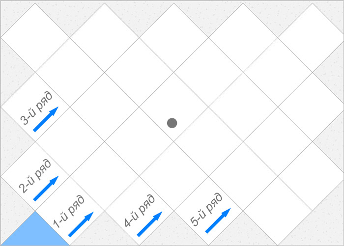 - в помещениях с небольшой площадью, например, в санузле, ванной, клеить плитку начинают с противоположного угла, и идут ко входу