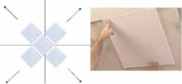- по диагонали. На потолке чертят две линии из угла в угол, место пересечения которых станет отправной точкой для монтажа. Потом чертят еще линии вдоль диагоналей;