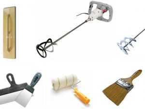 - Для работы подойдут инструменты, которые обычно применяют в штукатурных работах – правило, набор шпателей, дрель, уровень, емкости для приготовления раствора, сухие смеси.