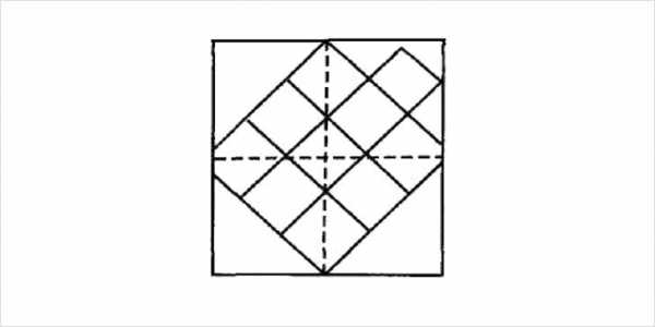 Π§ΡΠΎΠ±Ρ Π½Π°ΠΉΡΠΈ ΡΠ΅Π½ΡΡ Π½Π΅ΠΎΠ±Ρ ΠΎΠ΄ΠΈΠΌΠΎ ΠΈΠ· ΡΠ³Π»Π° Π² ΡΠ³ΠΎΠ» ΠΏΡΠΎΠ²Π΅ΡΡΠΈ Π΄ΠΈΠ°Π³ΠΎΠ½Π°Π»ΠΈ. Π§Π΅ΡΠ΅Π· Π½Π°ΠΉΠ΄Π΅Π½Π½ΡΡ ΡΠΎΡΠΊΡ ΡΠ΅Π½ΡΡΠ° ΠΏΡΠΎΠ²ΠΎΠ΄ΡΡΡΡ Π»ΠΈΠ½ΠΈΠΈ, Π΄Π΅Π»ΡΡΠΈΠ΅ ΠΏΠΎΡΠΎΠ»ΠΎΠΊ ΠΏΠΎΠΏΠΎΠ»Π°ΠΌ Π²Π΄ΠΎΠ»Ρ ΠΈ ΠΏΠΎΠΏΠ΅ΡΡΠΊ. Π’Π°ΠΊΠ°Ρ ΡΠ°Π·ΠΌΠ΅ΡΠΊΠ° Π½Π°ΠΏΠΎΠΌΠΈΠ½Π°Π΅Ρ ΡΠ°Π·ΡΠ΅Π·Π°Π½Π½ΡΠΉ Π½Π° 8 ΡΠ°ΡΡΠ΅ΠΉ ΠΊΠ²Π°Π΄ΡΠ°ΡΠ½ΡΠΉ ΡΠΎΡΡ. ΠΡΠ΅ ΡΡΠΈ Π»ΠΈΠ½ΠΈΠΈ ΠΏΠΎΠΌΠΎΠ³ΡΡ ΡΠ°ΡΠΏΠΎΠ»ΠΎΠΆΠΈΡΡ ΠΊΠ²Π°Π΄ΡΠ°ΡΡ ΡΠΎΠ²Π½ΠΎ Π½Π° ΠΏΠΎΠ²Π΅ΡΡ Π½ΠΎΡΡΠΈ.