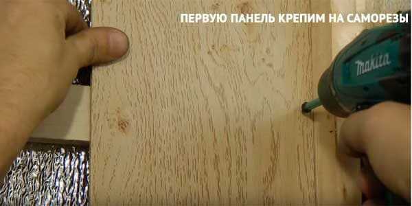 - Приложить первое изделие к стене, начиная от любого угла, и, удерживая, прикрутить к обрешетке. Саморезы вкручиваются в каждую планку обрешетки на расстоянии 1 сантиметра от края панели.