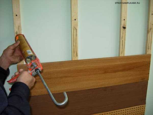 Клеить панели также можно на каркас. Тогда потребность в выравнивании стен отпадает, слоем клея покрываются рейки или деревянные бруски обрешётки. Для того чтобы приклеить панели ПВХ к стене, используется только специально предназначенный клей. По-другому он именуется «жидкие гвозди».