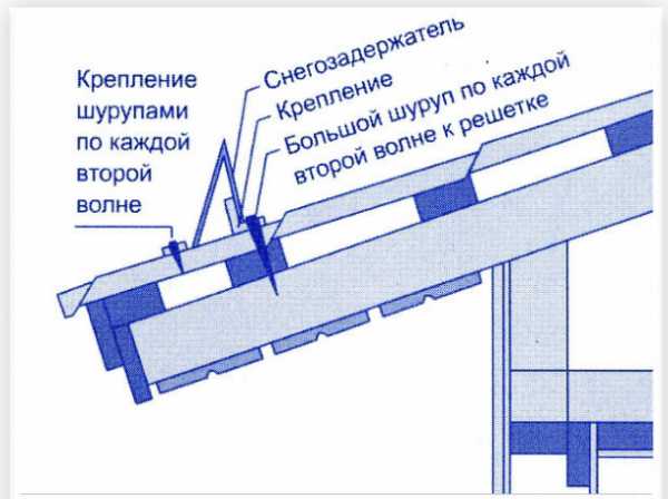 Снеговая лавина способна вырвать слабое крепление, повредив кровельное покрытие. Поэтому ввинчивать крепежные элементы нужно таким образом, чтобы они попадали в деревянную обрешетку, не ближе 2 см от края доски.