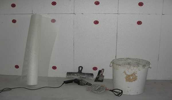Далее поверх слоя изоляции устанавливают сетку, фиксируя ее специальным клеем, и проводят работы по оштукатуриванию поверхности.
