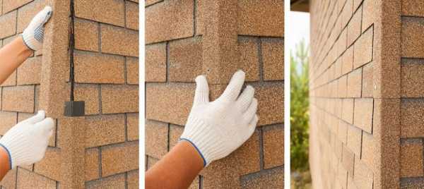Монтаж плитки ведется рядами от углов здания (с отступом в 5 мм) снизу вверх с нахлестом для лучшего внешнего вида и большей герметичности поверхности.
