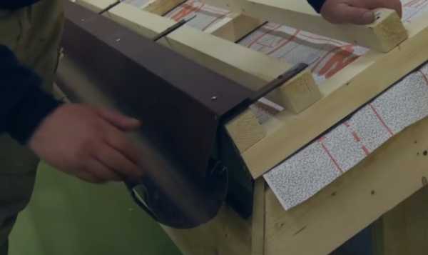 Понятно, что уложенные на бруски держатели будут выступать над поверхностью обрешетки, чтоб спрятать их, приходится укладывать еще один ряд деревянных реек. На крюки крепится водоотводящий желоб, а поверх только что уложенных брусков-накладок устанавливается карнизная планка кровли из металлочерепицы.