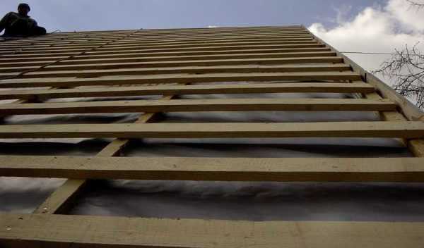 Листовой материал укладывается длинной стороной параллельно карнизу. Доски должны перекрывать не меньше двух прогонов и крепиться к каждой стропильной ноге. Стыковка элементов обрешетки выполняется на опоре, при этом стыки соседних рядов обрешетки должны располагаться на разных опорах.