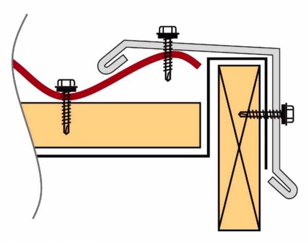 - Непосредственно перед монтажом карнизной планки выполняют установку кронштейнов для водосточной системы. Они могут иметь крепление, как на карнизной доске, так и на стропильных ногах.