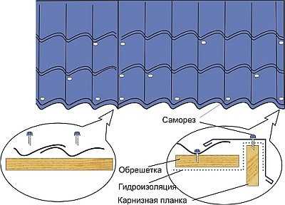 - кровельный лист подлежит креплению в месте прилегания к обрешетке в прогибе волны;