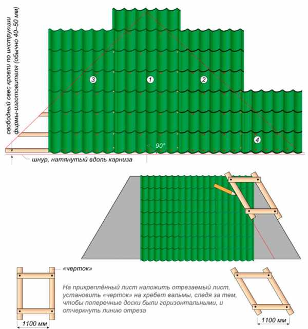 Когда черепица устанавливается на косых хребтах и на треугольных скатах, все листы обрезают. Выполняют обрезку прямо на крыше. Разметку металлочерепицы можно осуществить на специальном приспособлении – «чертке». Выполняется это следующим образом: беруться две параллельные доски, другие две укладываются на них перпендикулярно и скрепляются. Ширина досок не менее 100мм. При этом расстояние от левой доски до правой ровняется 1100мм.