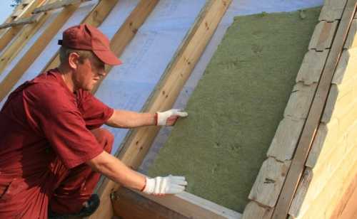 Поверх пароизоляции укладывают слой утеплителя. Зачастую материалы, используемые для этих целей, обладают и звукоизоляционными свойствами (читайте также: «Звукоизоляция крыши из металлочерепицы — монтаж и устройство»). Если помещение используется для ведения домашнего хозяйства или если планируется делать «холодную» крышу, то можно обойтись и без теплоизоляции.