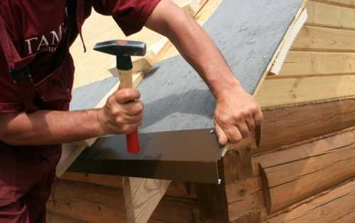 Идеально ровный край первого ряда достигается благодаря доске, прибитой с выступом в 4-5 см к торцам стропил. Позднее она демонтируется.