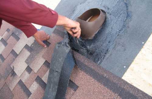 Выполняя установку металлочерепицы, следует обращать внимание на все детали монтажа. Если закрыть глаза на некоторые погрешности в монтаже, то в конце концов придется переделывать всю работу. Особенно аккуратно необходимо оформлять вентиляционные и дымовые трубы, выход для установки телевизионной антенны. Антенный вывод обрезают по верхней части. Далее его устанавливают на стойку. Все полученные стыки закрепляют силиконовым клеем и шурупами. Для вывода вентиляционной трубы, в черепице проделывают отверстие. Затем на проходной элемент металлочерепицы наносят силиконовый клей и для большей надежности его закрепляют шурупами.Для того, чтобы монтаж кровли в этом месте был правильным, следует выполнить следующие операции: