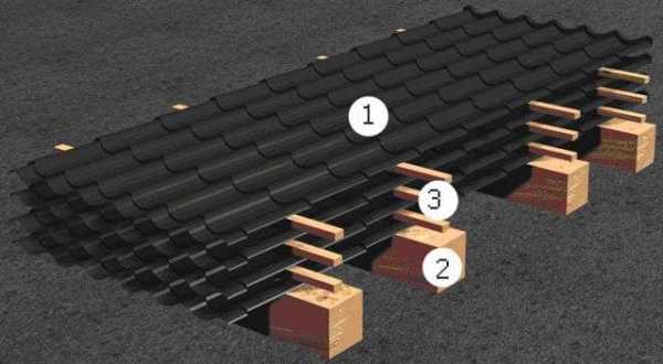 Для более удобного подъема листов черепицы на крышу обустраивают специальные лаги. В некоторых случаях, поверхность крыши имеет большие размеры, а на земле нет места для хранения металлочерепицы, или есть еще какая-нибудь причина, по которой подавать листы черепицы с земли очень неудобно, с этой целью на крыше устанавливают специальные стеллажи. Они служат для временного хранения строительного материала. Для того, чтобы покрытие листов не повредилось, их укладывают на рейки, при этом отделяя друг от друга. Защитную пленку с черепицы необходимо удалить сразу после ее укладки.