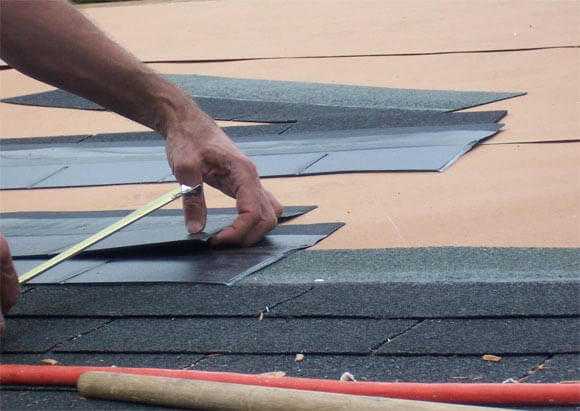 Чтобы изготовить черепицу, подходящую для конька, необходимо рядовую битумную черепицу разрезать на три части. На ребрах крыши коньковая черепица укладывается снизу вверх. После удаления защитной пленки она приклеивается и фиксируется четырьмя гвоздями в двух сантиметрах от края. Следующая часть приклеивается с нахлестом в 5 см.