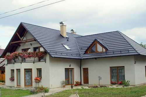 - Материал обладает достаточно высокой прочностью, которая обеспечивается за счет толщины самого листа, а также ребрами жесткости. Так, если стропила размещать на метровом расстоянии один от другого, а шаг обрешетки сделать равным 0,3 метра, то 0,5-миллиметровая черепица сможет выдержать нагрузку до 250 кг на квадратный метр.