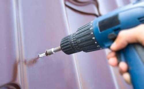 - укладка листов металлочерепицы. На этом этапе не обойтись без рулетки, шуруповерта, маркера, длинной рейки, а также молотка. Плюс ко всему понадобятся ножницы, пила дисковая, оснащенная твердосплавными зубьями, и электрический лобзик;