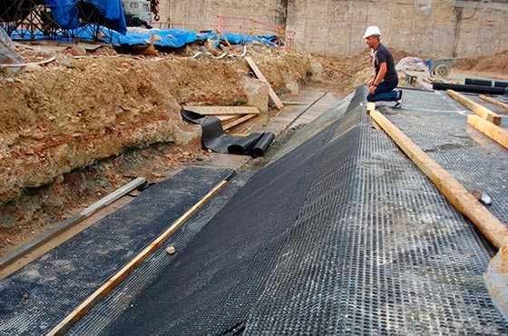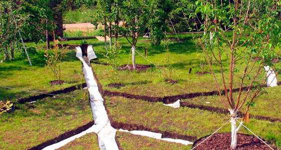 Дренирование почвы осуществляется траншеями, на дне которых нередко укладывают геотекстиль – материал, который пропускает только воду. Ширина ткани должна быть взята с небольшим запасом, чтобы использовать его для оборачивания фильтрующих элементов. Иногда вместо геотекстиля применяются схожие по свойствам материалы, например, флизелин или дорнит.