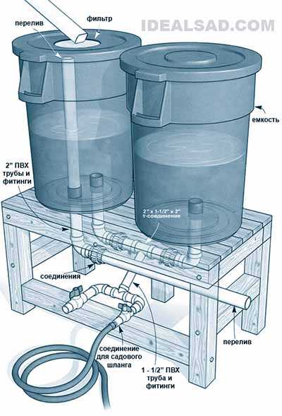 Если дождевой воды надо собрать много, то можно собрать более сложную систему сбора воды, которая основана на простом правиле сообщающихся сосудов. Таких дождевых бочек, соединенных между собой может быть как угодно много.