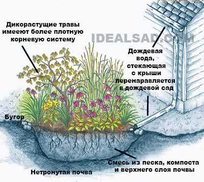 Дождевой сад представляет собой клумбу из дикорастущих растений, которая расположена в небольшом углублении на участке. Почва под такой сад специальным образом смешивается : песок, компост, почва; для того, чтобы усилить поглощающие способности цветника.