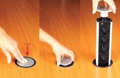 Они отличаются от выдвижных розеток методом открытия. Достаточно нажать на поверхность, и точка подключения готова к использованию.