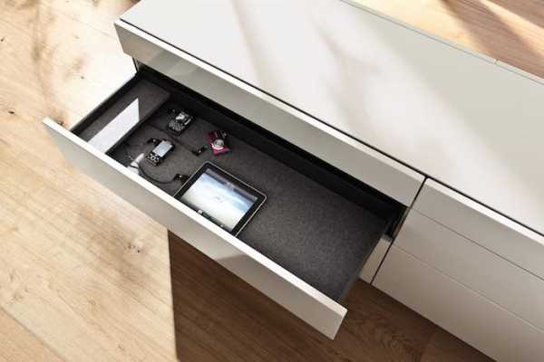 - в тумбах (на боковых или задних стенках) с выдвигающимися секциями или ящиками.