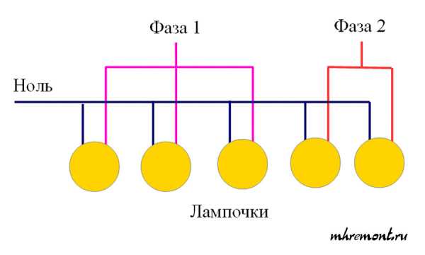 Рис.1. Провода в самой люстре соединяются следующим образом. Берут по одному проводу от каждой лампочки (обычно одного цвета) и соединяют вместе – это будет «0». Остальные провода делят на две части, они будут подключены к фазам выключателя, и соответствовать работе каждой клавиши.