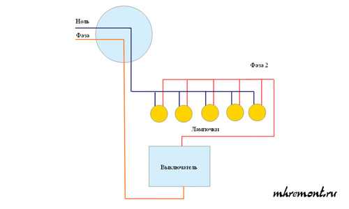 - Подключение светильников производится по параллельной схеме, каждая люстра рассматривается также, как при подключении одной с большим количеством патронов.
