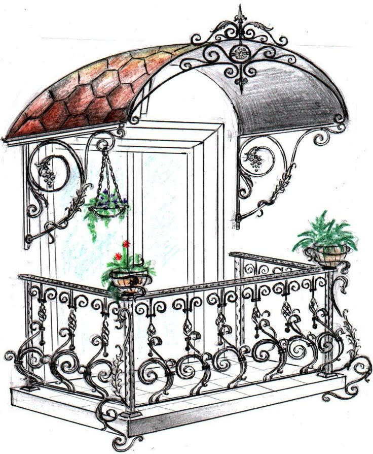 Затем дорисуем козырек крыльца и перила.