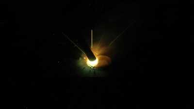 Теперь можно попробовать зажечь дугу. Для этого установите электрод под углом около 60 градусов по отношению к заготовке. Очень медленно проведите по поверхности электродом. После появления искр прикоснитесь электродом к заготовке и приподнимите его так, чтобы зазор не превышал 5 миллиметров. Если все сделано правильно, то зажжется дуга. Такой зазор нужно поддерживать на протяжении всего времени работы. Учтите, что электрод будет выгорать. Перемещать его надо медленно. Если произойдёт залипание электрода, то качните им в сторону. Если дуга длиной 2 — 3 миллиметра не зажигается, то необходимо увеличить силу тока на сварочном аппарате. Старайтесь получить устойчивую дугу длиной 3 — 5 миллиметров между деталью и концом электрода.