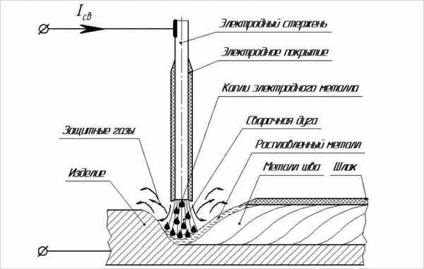 Покрывающий поверхность сварочной ванны и капель расплавленного электродного металла, шлак препятствует их взаимодействию с атмосферным воздухом и способствует очищению от примесей расплавленного металла.