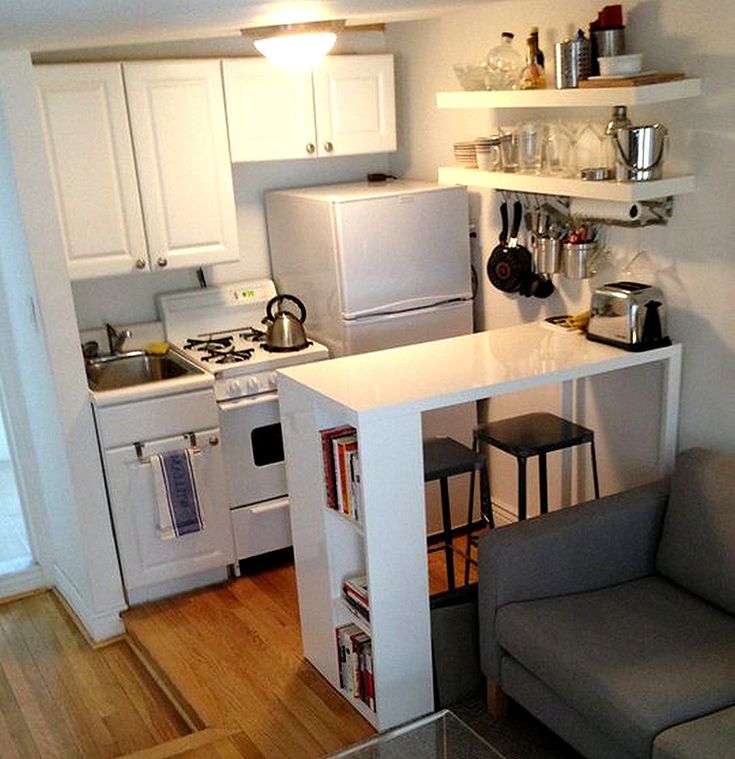 Для обустройства кухонного пространства следует подбирать модульные кухни и использовать встроенную бытовую технику. В качестве рабочей поверхности можно использовать компактную барную стойку. Кроме того, для обеденного уголка можно приобрести складные стулья и стол-трансформер, которые легко убрать в случае ненадобности.