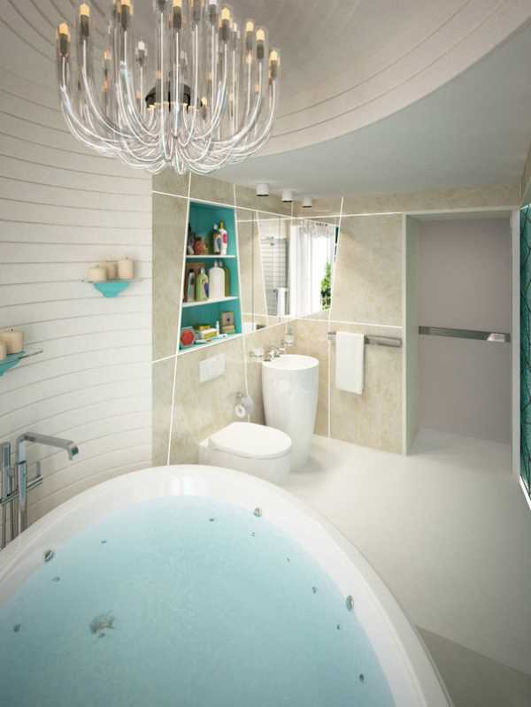 В просторной ванной с естественным освещением дизайнер возвращается к центральной теме интерьера. Круглая ванна на подиуме встроена в полукруглую нишу возле окна — светлое и элегантное решение. Романтичности добавляет люстра в стиле фьюжн и легкий тюль.
