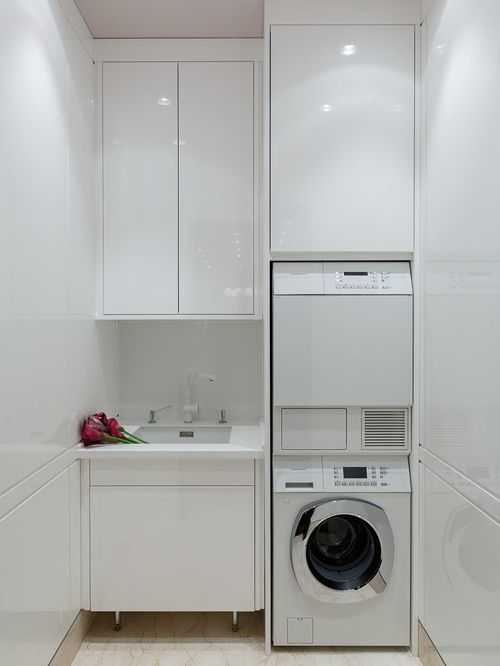 Такой проект стоит реализовать в квартире с тесным санузлом. Посмотрите на примыкающую к санитарной зоне кладовку. Ее площади вполне хватит, чтобы разместить стиралку, бельевую сушилку, а также обустроить зону глажки с полноценной гладильной доской. Последняя может появиться даже в крохотной кладовке в хрущевке, если использовать доску для глажки откидной конструкции. Ее можно будет прикрепить непосредственно к дверям и раскладывать не в замкнутое кладовочное пространство, а в коридор или комнату. Это избавит от необходимости дышать горячими парами и сделает процесс глажки более комфортным.