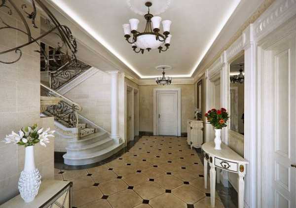 На полу у входной двери может располагаться кафель или линолеум, а в холле отделка пола может быть выполнена при помощи паркета или ковролина. Прекрасное решение для длинного и узкого помещения – полы на разном уровне, когда прихожую от холла разделяют несколько ступенек.