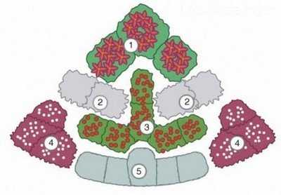 Π€ΠΎΡΠΌΠ° ΡΠ²Π΅ΡΠ½ΠΈΠΊΠ° ΠΈΠΌΠ΅Π΅Ρ Π²ΠΈΠ΄ ΠΊΠΎΠ½ΡΠ΅Π½ΡΡΠΈΡΠ΅ΡΠΊΠΈΡ ΠΊΡΡΠ³ΠΎΠ²: ΡΠ΅Π½ΡΡ Π·Π°ΠΏΠΎΠ»Π½ΡΠ΅ΡΡΡ ΡΠ΅ΠΌΠ½ΠΎΠ»ΠΈΡΡΠ½ΡΠΌΠΈ ΠΊΠ°Π½Π½Π°ΠΌΠΈ (1), ΠΊΠΎΡΠΎΡΡΠ΅ Π²ΡΡΡΡΠΏΠ°ΡΡ ΡΠΎΠ»ΠΈΡΡΠ°ΠΌΠΈ ΠΊΠΎΠΌΠΏΠΎΠ·ΠΈΡΠΈΠΈ, Π΄Π°Π»Π΅Π΅ ΠΏΠΎ ΠΊΡΡΠ³Ρ Π²ΡΡΠ°ΠΆΠΈΠ²Π°ΡΡΡΡ Π·Π΅Π»Π΅Π½ΠΎΠ»ΠΈΡΡΠ½ΡΠ΅ ΠΊΠ°Π½Π½Ρ (2), Π΄Π΅ΠΊΠΎΡΠ°ΡΠΈΠ²Π½ΠΎΠ»ΠΈΡΡΠ²Π΅Π½Π½ΡΠΉ Π³Π½Π°ΡΠ°Π»ΠΈΡΠΌ (3) ΠΈ Π»ΡΠ²ΠΈΠ½ΡΠΉ Π·Π΅Π² (4)