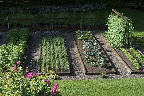 Вместе с овощами можно посадить цветы, которые красиво дополнят овощные культуры. Дорожки оформляются гравием, плиткой, камнем или газонной травой.