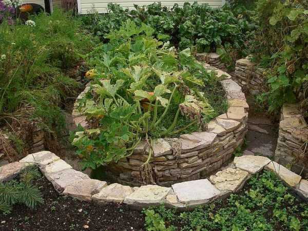 Ограда для грядок сложена из плитняка — пиленного природного камня