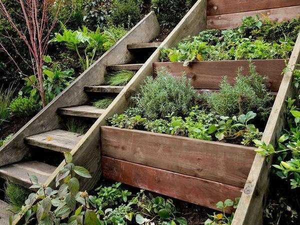 Простые бортикиДля небольшой площади подойдет вертикальная ориентация посадки. В этом случае можно воспользоваться ступенчатой конструкцией, на которой будут размещаться ящики с почвой. Подобные сооружения применяются для выращивания фасоли, гороха или огурцов. Как вариант, попробуйте арки и лесенки.
